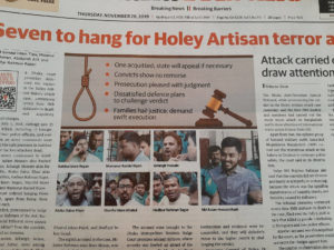 Dopo un processo lungo 3 anni le ultime sette persone coinvolte nella preparazione dell’attentato terroristico all’Holey Artisan nel quartiere di Gulshan sono stati condannati a morte. Raid, indagini, interrogazioni, testimonianze hanno convinto i giudici che queste sette persone (in realtà otto, uno è stato prosciolto dalle accuse) non meritano alcuna foma di clemenza e pietà; del resto fa rabbia vedere che fino al momento dell’arrivo in tribunale non hanno mai mostrato segni di cedimento o pentimento, anzi, all’uscita dal furgone con cui sono giunti in tribunale, un paio hanno puntato l’indice al cielo, segno della loro fede nell’unicità di Allah, due indossavano copricapi con la scritta IS (Islamic State) a cui mai hanno negato di appartenere, altri sogghignavano. Alla fine della lettura della sentenza si sono abbracciati. Era quello che volevano e quello che succederà, in attesa della ricompensa divina: