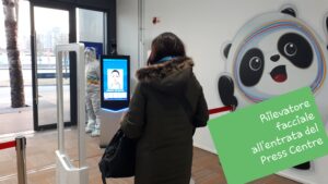 L’accoglienza è la stessa: tute bianche coprenti per gli addetti alla sicurezza. Questa volta dietro gli occhialoni di plastica, uno sbattito di ciglia folti e una voce femminile che mi chiede con garbo di avvicinarmi al dispositivo rilevatore di presenza facciale. E, come per magia, il mio volto compare sul display della macchina.