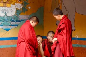 Inside Gantey, all of the walls were colored and the paintings were mind-blowing, there was no light because the thunderstorm of the day before had blustered away the electricity, but to our astonishment we saw 30 little monks sitting in the dark listening to their Guru. He was explaining the parable about the good and evil.