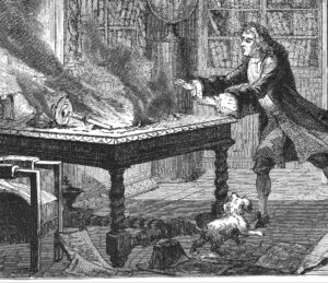 Non fece invece la tragica fine dei suoi padroni,( i Romanov), Joy, il Cocker Spaniel di Alexei l’erede maschio. Quando fu sterminata l’intera famiglia reale, lui non era nella casa perchè, da buon curioso, si era allontanato nei campi. Fu trovato da un soldato zarista e fu adottato da Giorgio V, continuando la sua vita regale, alla corte inglese. Nei Windsor Gardens c’è una lapide che recita:” Qui giace Joy”. A Isaac Newton, il suo fedele Pomeranian, Diamond fece invece un brutto scherzo. Mentre lo scienziato inglese lavorava, a lume di candela, alla legge di gravitazione universale, il suo fedele amico a quattro zampe, con un colpo di coda, fece cadere la candela sui fogli e gli scritti in latino. E il tomo di così tanto ingegno andò in fumo. Newton ci mise un anno a rifare tutto. Qui c’è tutto il genio e la sregolatezza del padrone e del cane!