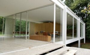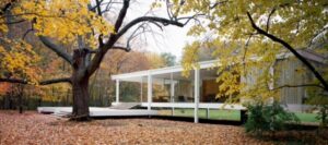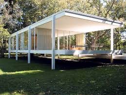 Villa Farnsworth, progettata e costruita negli anni cinquanta (1945-1951) dall’architetto Mies van Der Rohe, residenza per la villeggiatura della famiglia Farnsworth. Questa “scatola di vetro” poggiata sul travertino, sostenuta da pilastri e travi di acciaio, racchiude al suo interno una “scatola molto più intima” in legno.