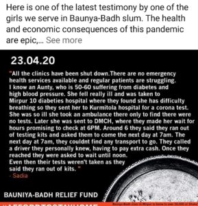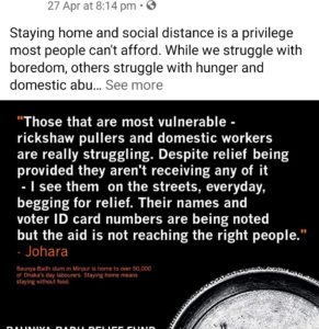 Covid19 – Help the helpless è un’iniziativa di raccolta fondi da me avviata per aiutare le famiglie più colpite dal lockdown imposto dal governo a partire dallo scorso 25 marzo non solo a Dhaka ma anche in tutto il resto del paese.