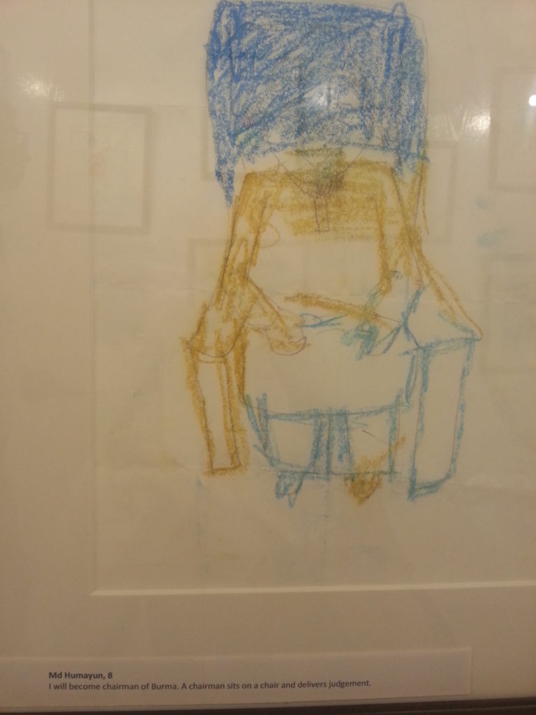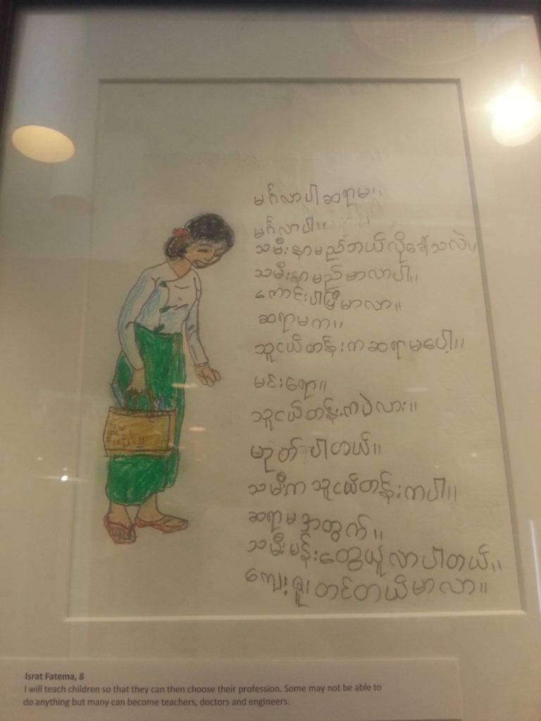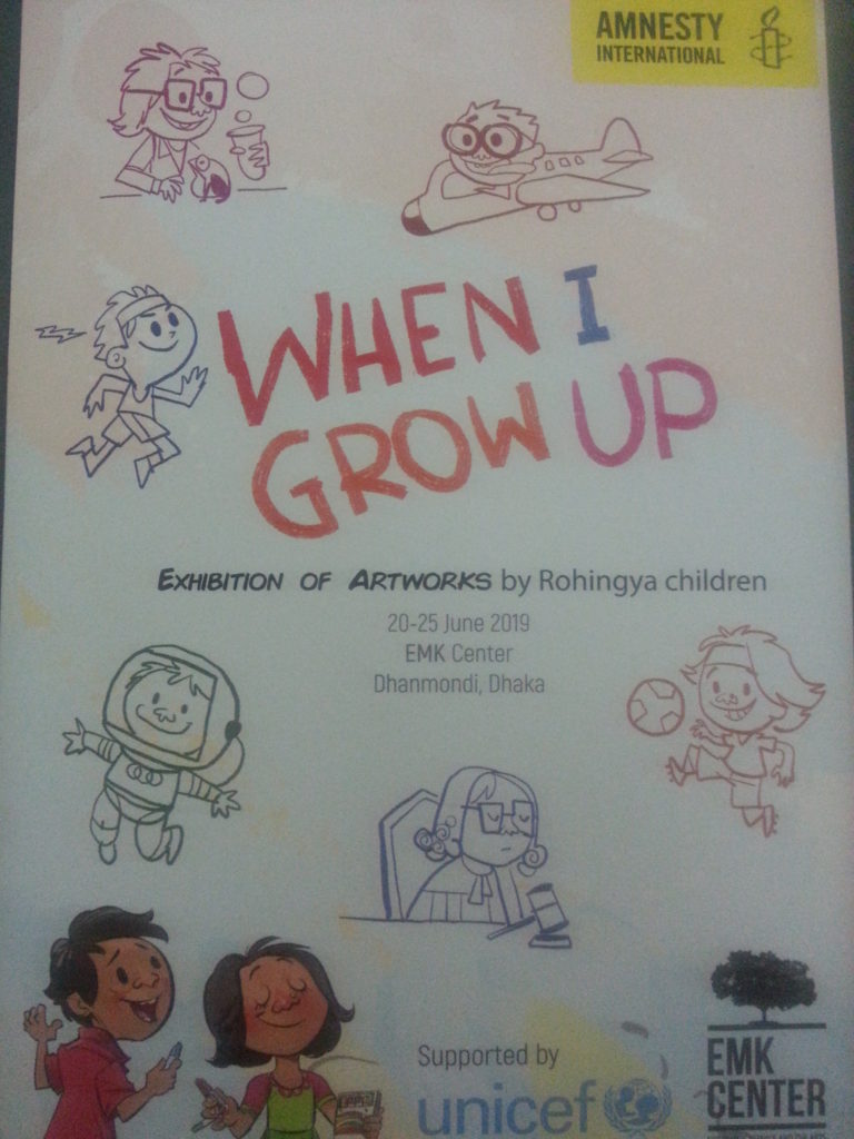 In occasione della giornata mondiale dei rifugiati, lo scorso 20 giugno Amnesty International (AI) in collaborazione con il centro americano EMK di Dhaka hanno organizzato una mostra di 160 disegni intitolata When I grow up eseguiti dai bambini Rohingya che si trovano nel campo profughi di Kutupalong in Bangladesh. Si stima che ad oggi ci siano circa 1.100.000 profughi Rohingya in Bangladesh di cui circa 500.000 sono bambini al di sotto dei 14 anni.