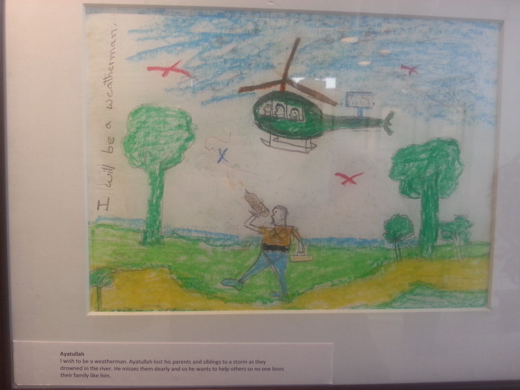 “Se fossi stato un bravo metereologo”, scrive in fondo al suo disegno, “avrei potuto prevedere il temporale che ha ingrossato le acque del fiume dove mia mamma e i miei fratelli, nel tentativo di attraversarlo, sono annegati”.