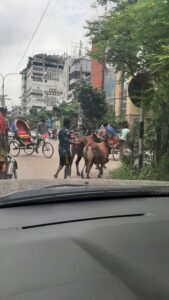 Anch’io sono uscita con la mia macchina, prima avrei rischiato una bella multa, non per comprare una mucca ma per fare le foto per Matilde e per farvi vedere un pò cosa vuol dire vivere a Dhaka nei giorni precedenti Qurbani Eid. Sono giorni in cui gruppi di caprette e montoni ti attraversano la strada, bravissimi e composti dietro al loro padrone, camion scoperti carichi di mucche ti sorpassano per andare a scaricarle nel più vicino mercato, guardi fuori dal finestrino e ti ritrovi faccia a faccia con un bel bufalo, ma fai finta di niente e acceleri prima che si innervosisca.