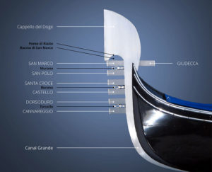 Venezia è suddivisa in sei sestrieri, San Marco, San Polo, Castello, Santa Croce, Dorsoduro e Cannaregio, ha 3 isole ben conosciute nella parte nord della laguna, Murano, Burano e Torcello, e un’isola litorale a sud, la Giudecca. Come si evince dalla foto, i denti grandi del pettine sono i sestrieri, i piccolini le isole, il dente contrario la giudecca. Ma non solo, la parte superiore del ferro rappresenta un cappello, quello dei Dogi, mentre l’asta curva, rappresenta il Canal Grande. Praticamente Venezia in tutte le prue delle gondole, quasi come una sorta di mappa, di carta nautica, sempre con l’occhio del Doge che “vegliava e comandava” su tutto.