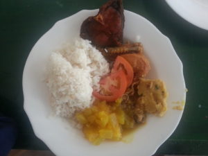 I bengalesi riescono a ingurgitare enormi quantità di riso. Di conseguenza una sola porzione non basta. Non serve chiedere, il riso ti viene catapultato automaticamente sul piatto ancora prima che tu abbia finito quello che ancora avevi. La moglie dell’oste non mangia, non si siede al tavolo con gli ospiti ma sta in piedi, dietro al marito, una mano sul fianco l’altro sull’orlo della sua sedia e sta attenta che i piatti degli ospiti siano sempre pieni, fa portare altro riso quando vede che scarseggia o le altre pietanze; come in una catena di montaggio, dalla cucina arrivano ciotole di continuo, una dopo l’altra, o un bicchiere, o il piattino per gli ossi o la lisca del pesce. Non si arrendono neanche quando metti le mani incrociate sopra il piatto in segno di resa.