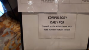 La verifica del passaporto è invece veloce. Si poggia il documento su un lettore e le istruzioni sono anche in italiano. Riesco a farlo anch’io e vi assicuro che sono negata in queste procedure tecnologiche. La macchina sputa un codice a barre che è un lasciapassare per i controlli successivi. Si continua a camminare in percorsi costellati da personale in tute bianche fino allo sportello dell’ufficio immigrazione. Una bella fotografia per il lettore digitale e due chiacchiere con il doganiere che mi saluta con un ciao divertito ma inscatolato in una gabbia di plexiglass. Mi prende il passaporto e l’accredito stampa, non prima di aver immerso le mani guantate nel disinfettante che impregna anche i miei documenti.