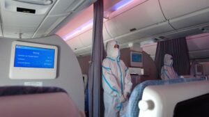 L’intero equipaggio indossa tute bianche coprenti, guanti e mascherine isolanti. Occhi gentili dietro le spesse lenti degli occhialoni anticontagio. Assomigliano molto alle maschere subacquee. E’ solo possibile immaginare il sorriso di chi le indossa e intuire se appartiene a una donna o a un uomo. Il primo controllo è chiaramente la temperatura. L’assistente di volo indirizza il termometro digitale sul mio polso: 36.3. Passo il primo controllo e faccio il mio ingresso nel velivolo. Occupo da sola una fila da tre, nel rispetto del distanziamento. E’ così anche per gli altri passeggeri. Nella tasca del mio sedile trovo una busta trasparente contenente alcuni snack per il viaggio: carne essiccata, un mini wurstel sottovuoto, del pane imbustato, arachidi, patatatine, una confezione di latte a lunga conservazione, un micro plumcake e dei biscottini. Dimenticavo: 2 bottigliette d’acqua. Niente di caldo. Zero caffè, tè. Inizia la traversata. Il personale di bordo si muove a piccoli passi ma veloci. Ogni tre ore si misura la temperatura. La mia, segna 37.3.