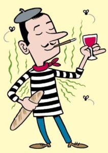 Snob, pigri, non si lavano….scioperano sempre e poi non fanno nessuno sforzo per capire gli stranieri, fanno finta di non parlare inglese, chic, arroganti, portano ancora la baguette sotto l’ascella e bevono sempre champagne! Però che lingua romantica il francese!