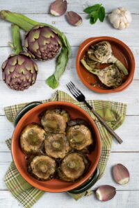 Nella ricetta tradizionale romana i carciofi vengono svuotati e riempiti di aglio tritato e mentuccia. In alcuni casi potete aggiungere anche alcune foglie di salvia.
