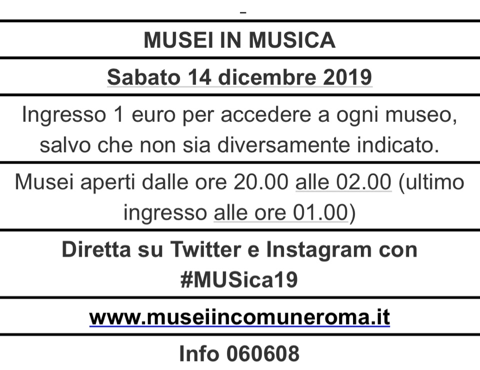 Il 14 dicembre a Roma scatta “il giorno x” per Musei in Musica. L’iniziativa, inserita nel più vasto progetto Musei in Festa, prende il via sabato ed è ormai arrivata con successo alla sua undicesima edizione. La capitale è dunque pronta per accoglierne tutti gli appuntamenti fino al 6 gennaio. Il Museo dell’Ara Pacis, la Casina delle Civette, Palazzo Braschi e i Musei Capitolini, sono solo alcuni dei luoghi – quelli “in” dicono location – in cui musica e arte si mostreranno al pubblico per regalare suggestioni uniche. Al link qui sotto, tutte le info utili: http://www.museiincomuneroma.it/