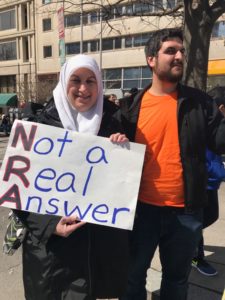 “Chiunque uccida una persona ingiustamente, e’ come se avesse ucciso l’intera umanità” (Corano 5:32). Somayyah regge, con l’aiuto di due studenti, lo striscione della Scuola musulmana di Washington di cui e’ la preside e che, con centinaia di altre scuole ha occupato Pennsylvania Avenue per partecipare alla “March for our lives” organizzata dagli studenti di Parkland dopo la sparatoria del 14 febbraio scorso durante la quale hanno perso la vita 17 persone. Da allora, un movimento di ribellione, forte, inarrestabile, ha unito il paese da est a ovest, da nord a sud, per chiedere che vengano finalmente approvate delle leggi per limitare la diffusione incondizionata di armi.