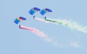 Ora gli sguardi sono rivolti al cielo, oggi limpido, per lo spettacolo più bello: i paracadutisti che solitamente chiudono la parata lanciandosi in aria e atterrando in prossimità delle tribune d’onore.