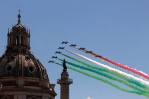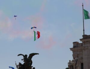 Eccole! Il rombare degli aerei squarcia il silenzio di una mattina tranquilla, il cielo all’improvviso da azzurro si tinge dei colori della nostra bandiera. E’ un passaggio rapidissimo ma emozionante. Poi, attraversando le strade di una Roma ancora assonnata, arrivo fino a Piazza Venezia: tanti i turisti stranieri, tante le persone venute da ogni parte d’Italia che si uniscono ai numerosi cittadini romani per applaudire il passaggio delle Forze Armate.