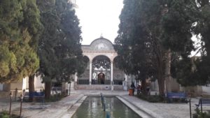 All’esterno, dal balcone abbiamo ammirato il cortile con la vasca centrale circondato dagli alberi. Questo era un esempio tipico di giardino iraniano. Non volevo disturbare chi era venuto là per pregare, quindi ho cercato di parlare a bassa voce. Vorrei ringraziare Shayan, che con le sue originali idee
