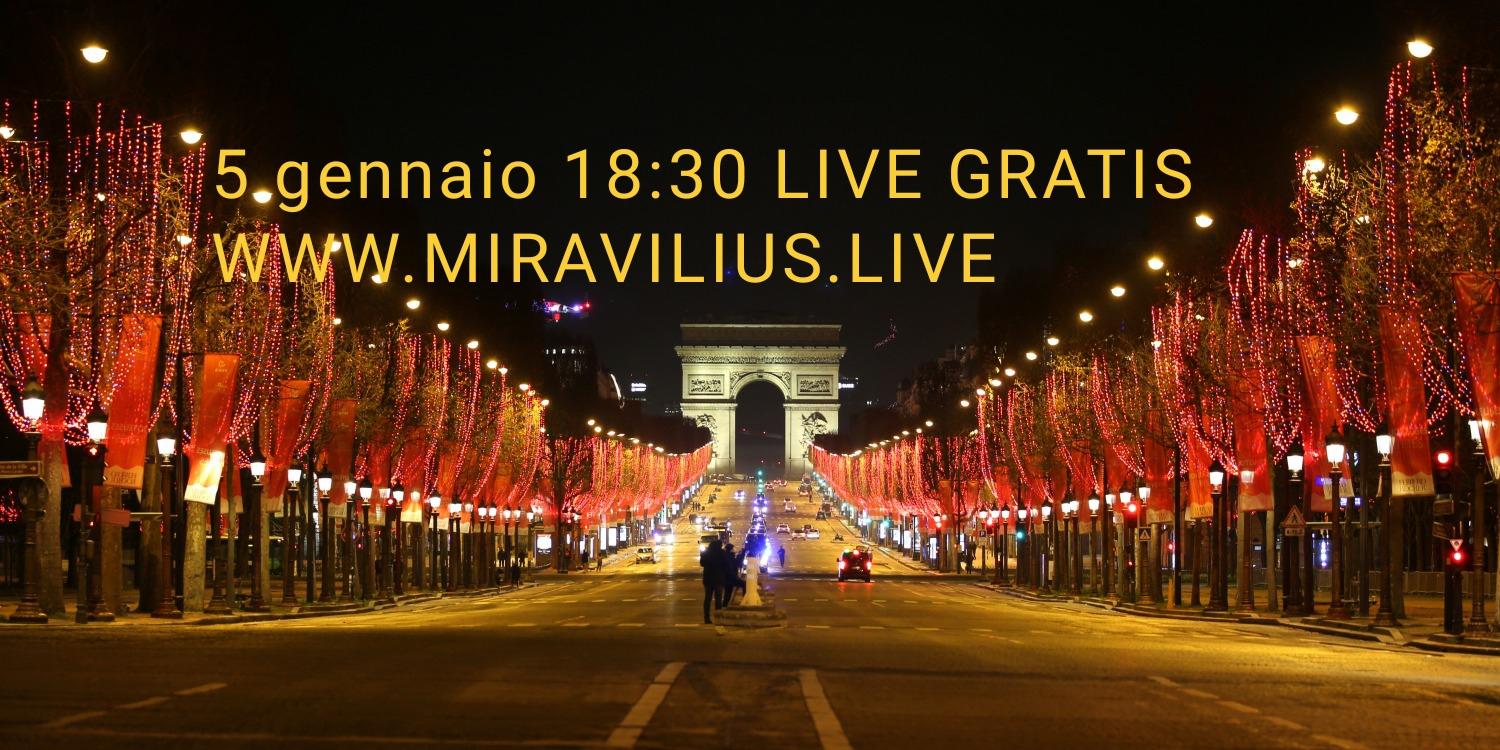 Come molti di voi già sanno vivo in questa bellissima città da oltre 25 anni e sono guida ufficiale dal 1998. Dopo tutti questi anni la città continua ad affascinarmi e a esercitare il suo grande carisma. Il 5 gennaio alle ore 18h30 faro’ un collegamento LIVE, in diretta dagli Champs Elysées per mostrarvi quella che i francesi chiamano la “Avenue più bella del mondo”, si….i soliti esagerati, in ogni caso resta uno dei viali più prestigiosi d’Europa. Il collegamento é GRATUITO, basta iscriversi presso la piattaforma http://www.miravilius.live.