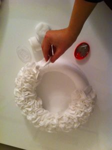 In ultimo create un gancio con nastrini di raso o con del merletto ed incollatelo sul retro della corona, vi servirà per appenderla. Di tanto in tanto spruzzate la vostra ghirlanda con essenze profumate.