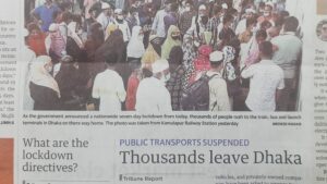 Fuori Modi, entra il lockdown. Il giorno dopo la sua dipartita, la primo ministro dichiara che a partire dal 5 aprile e per una settimana sara’ imposto il lockdown. La parola lockdown per i bengalesi e’ sinonimo di ferie e di un fuggi-fuggi generale nelle seconde case fuori Dhaka o nel villaggio natio. Alla notizie della chiusura, si sono affrettati tutti a lasciare Dhaka, chi sugli autobus, chi sul treno e chi in traghetto, tra l’altro uno e’ addirittura affondato per sovraffolamento causando la morte di 35 persone. E’ un fenomeno impossibile da evitare perche’ tra queste persone ci sono molte che arrivano a Dhaka per sbrigare faccende urgenti di vario tipo, alloggiano un paio di giorni da un parente – tutti hanno almeno un parente a Dhaka – e poi ripartono; non hanno alcuna sede fissa qui e quindi alla notizie di un’eventuale chiusura, devono rimettersi in viaggio.
