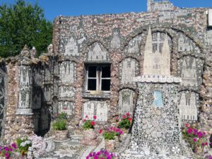 Picasso aveva voluto incontrarlo e vedere la sua opera. Ne rimase colpito. E’ un’opera di tutta una vita, una realizzazione unica e irripetibile. Si chiama Raymond Isidore, nasce nel 1900 in una famiglia umile, compra un terreno a Chartres e passa tutta la sua vita a raccogliere (per strada, nelle immondizie…dove trova) piatti, cocci di vetro e porcellana e viene soprannominato “Pique assiette” (letteralmente : rubapiatti).