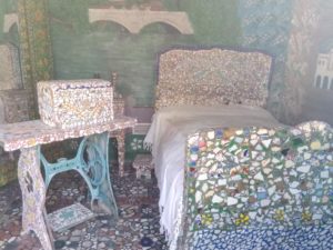 Di giorno va in giro con un sacco enorme alla ricerca di piatti e di sera (realizza tutto esclusivamente di notte, come in un sogno) incolla i frammenti nella sua casa: dappertutto! In cucina, camera da letto, giardino, sui mobili, sui muri…un vero mosaico gigantesco, onirico e inimmaginabile. Tutti questi cocci prendono delle forme suggestive, in una stanza avete la riproduzione della cattedrale di Chartres, del Mont Saint-Michel…dai cocci nascono fiori, un pavimento sparso di diversi fiori. Quando non ha più muri dentro casa da ricoprire inizia a lavorare all’esterno, il giardino, muri e pavimenti che portano all’abitazione si ricoprono di