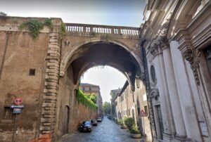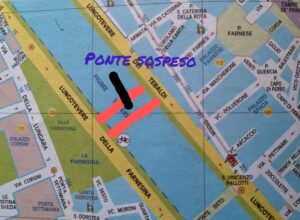 Brevemente la storia: Papa Paolo III Farnese aveva commissionato a Michelangelo la costruzione di un ponte di collegamento tra palazzo Farnese da un lato e i giardini della Farnesina dall’altra parte del fiume. Per una serie di impedimenti, anche di natura economica, questo ponte fu iniziato (attualmente sovrasta l’arco Farnese su Via Giulia), ma mai completato.