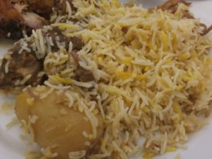 Io la guardo, lei mi guarda. Gli sguardi si incrociano. Coperta da biriyani, adornata da piccoli pezzetti di agnello, c’è una patata, dorata, fumante, intrisa di succo. Sarà tutta per me? Ce la farò? Ci sono altre otto paia di occhi che la guardano e che la vorrebbero sul loro piatto. Mano a mano che il riso diminuisce, capisco che quella è l’unica patata del piatto. UNA PATATA PER OTTO PERSONE! Accidenti, sarà dura. Il piatto gira, si sta avvicinando, non la perdo d’occhio, c’è ancora. A poco a poco lo sferragliare metallico delle posate sostituisce il mormorio e le chiacchere delle zie. Ci sono ancora due persone prima di me.