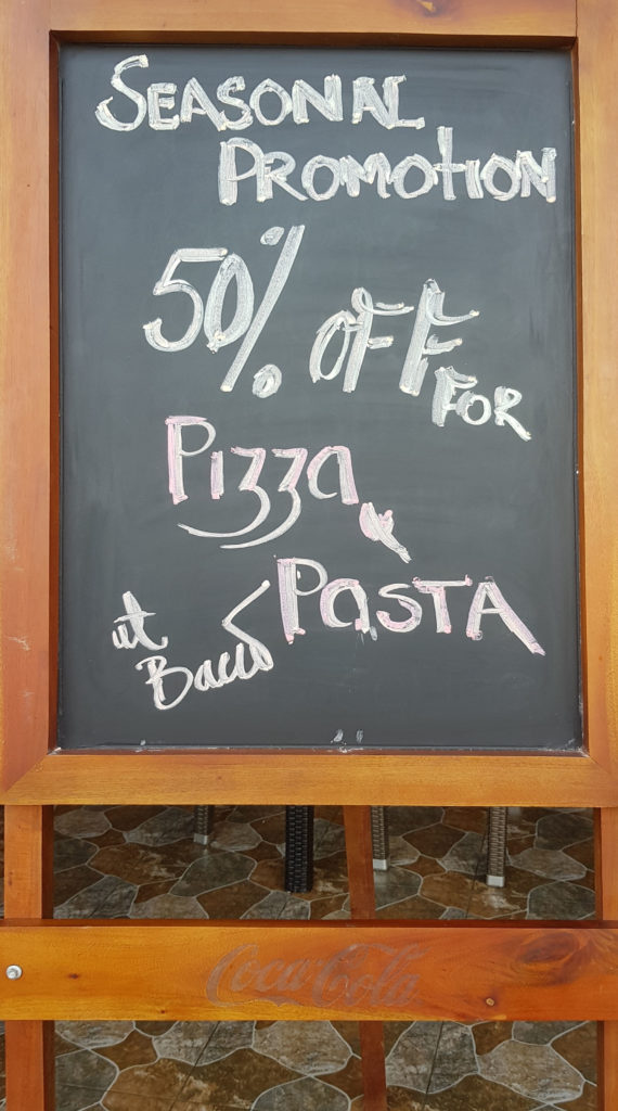 I go to see Roy, more than twenty years of experience in the kitchen with Italian chefs, owner of two restaurants and a small Suite hotel. At the entrance there is a blackboard that informs customers of a 50% discount on pizzas … But he is unleashed, very busy in new projects: “I am organizing, I open a pasta corner, invest in fresh and quality, I restructure a part of the restaurant and then in August .. “- Excuse me Roy but the place is empty .. – and he answers” not for long, you’ll see, it will start again soon and better than before “. Hooray!